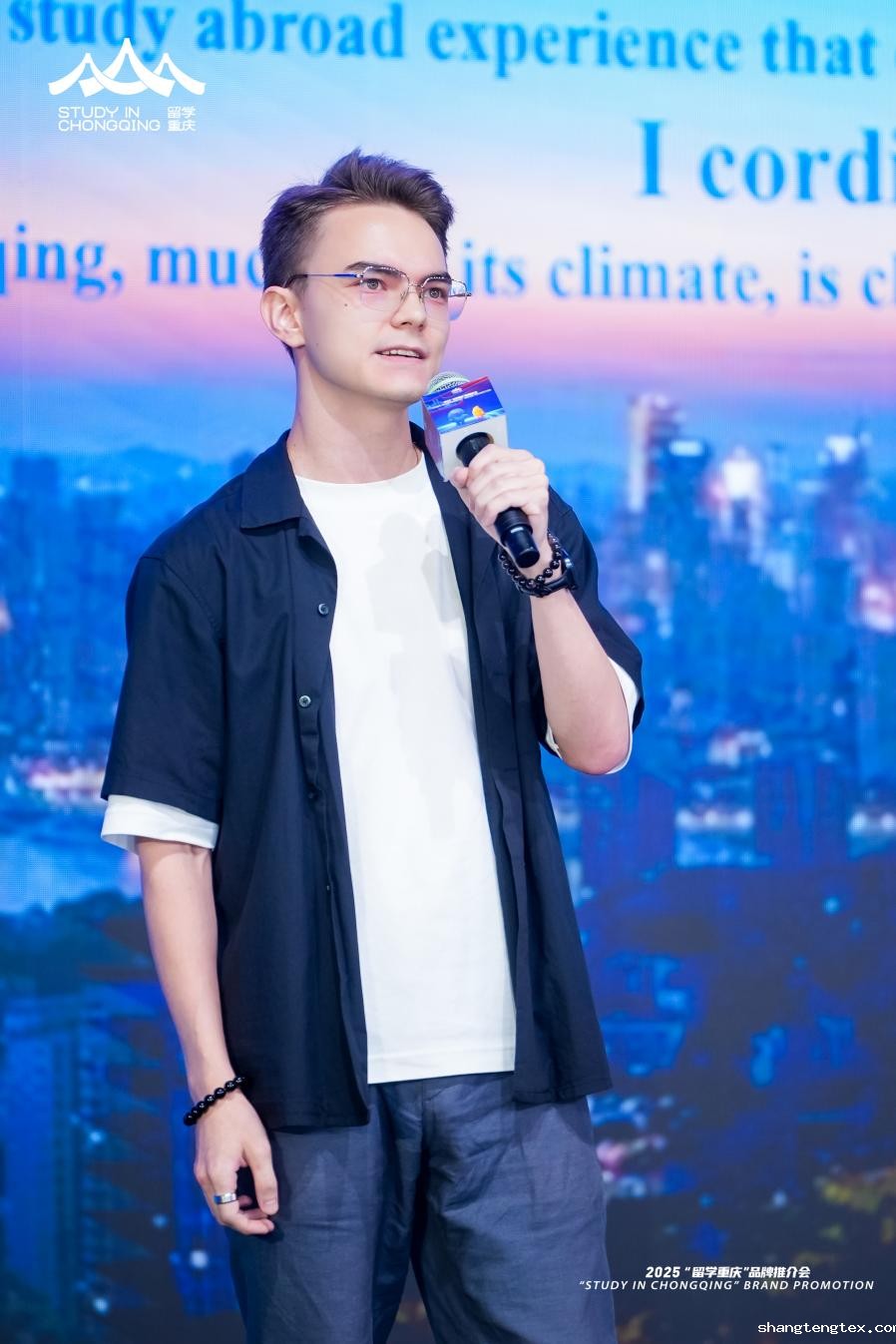 活动现场,俄罗斯籍学生安东作为“留学重庆”宣传大使分享了他的“重庆故事”。从初到重庆时被山城独特的地形与烟火气带来的视觉震撼,到融入本地生活中感悟的市井智慧与求学历程中的成长蜕变,再到通过汉语学习与中国文化产生的精神共鸣,安东用真挚的语言讲述了他与重庆的双向奔赴。他热情邀约全球青年:“来重庆吧,在这里‘渝’见更好的自己!”