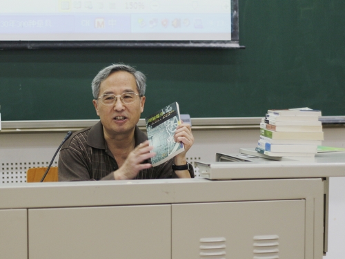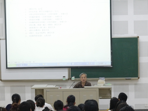 何道宽教授简单地回忆了过去,通过自己的学习经历引出了此次讲座的主题:学问是相通的。他说到外语院校的学生尤其要注重打通各个学科。他到深圳大学任教后,开始大量翻译书籍,而其中大部分成果与新闻传播相关,所以他开始了关于新闻传播学的研究,但他谦虚地说自己在新闻传播学方面的成就只是“一条腿进了传播学”。随后他向大家简单介绍了自己关于新闻传播学的几本书,如《菊与刀》、《变化中的时间观念》、《传播的偏向》等,并通过08年深圳大学25周年前夕学生记者采访稿《百万教授遨书海》讲解了他读书、教书、著书的过程。