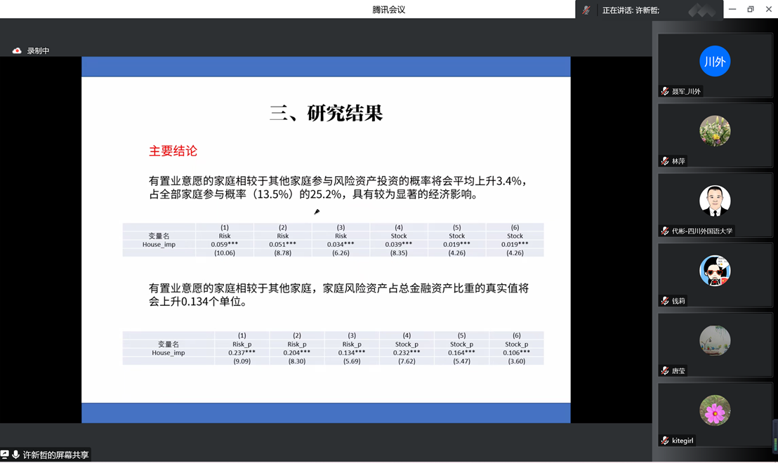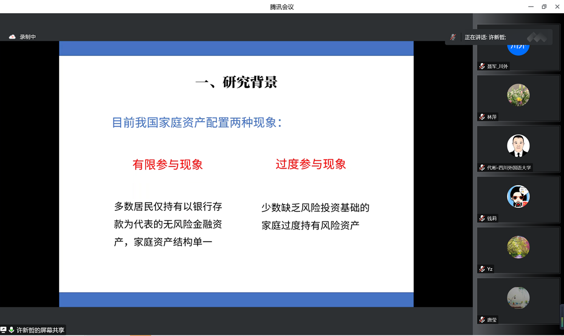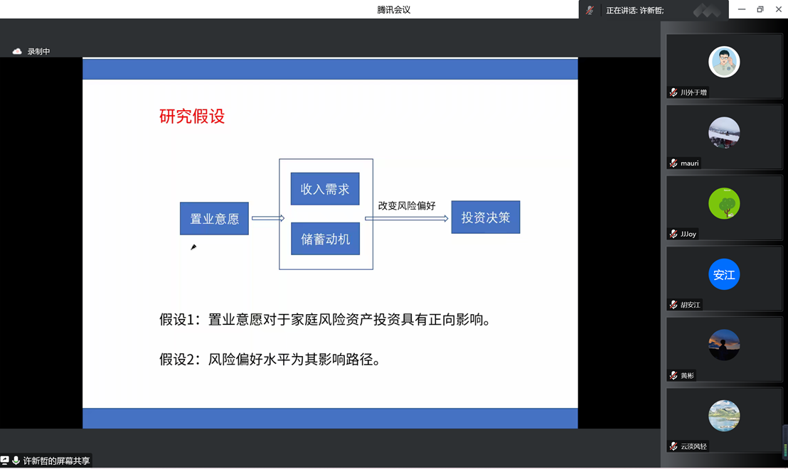 学院于11月11日以在线方式举办第九期“萃英学术论坛”活动。本期论坛主讲嘉宾为我院财务管理专业的许新哲博士,主题为“置业意愿与家庭资产配置”。我院代彬副院长、王婷副书记、党文娟院长助理以及科研处胡安江处长等共计30余位老师参加了本期论坛,本期论坛由彭志强副教授主持。