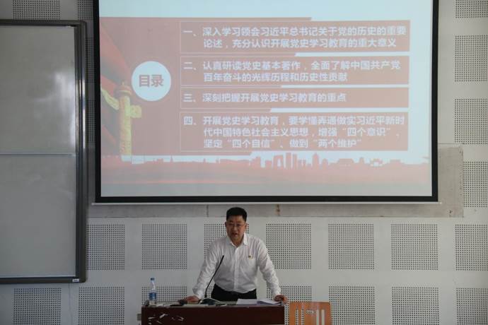 本次党史教育宣讲分为五部分:一是深入学习领会习近平总书记关于党的历史的重要论述,充分认识开展党史学习教育的重大意义;二是认真研读党史基本著作,全面了解中国共产党百年奋斗的光辉历程和历史性贡献;三是深刻把握开展党史学习教育的重点;四是要学懂弄通做实习近平新时代中国特色社会主义思想,增强“四个意识”、坚定“四个自信”、做到“两个维护”;五是要坚持学用结合,把学习成果转化为推动学校高质量发展的动力和成效。