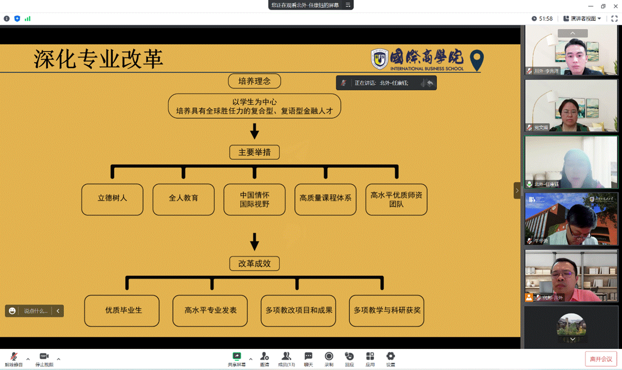 牛华勇院长首先介绍了北外国际商学院的学科专业构成、一流专业建设情况和人才培养理念等。随后,裴艳丽代表电子商务专业、任康钰代表金融学专业,分别从培养方案改革、跨校联培、虚拟教研室建设、产教融合等方面,先后介绍了各自专业的建设经验。最后,辅导员谭佳琳分享了北外国际商学院“以‘四维格局’构建,促‘三力一度’提升”的学生工作思路与经验举措。
