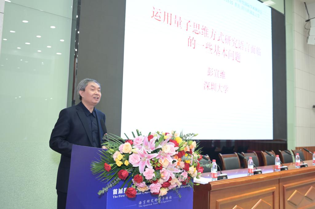 深圳大学外国语学院博士生导师彭宣维教授作了题为“运用量子思维方式研究语言面临的一些基本问题”的主旨报告。他详细阐释了五个方面的基本问题,即从析取性经典思维转向合取性量子思维,语言的量子化问题,语言的量子性问题,语言功能的量子态问题,以及语言符号的作用力及其相关术语体系问题。