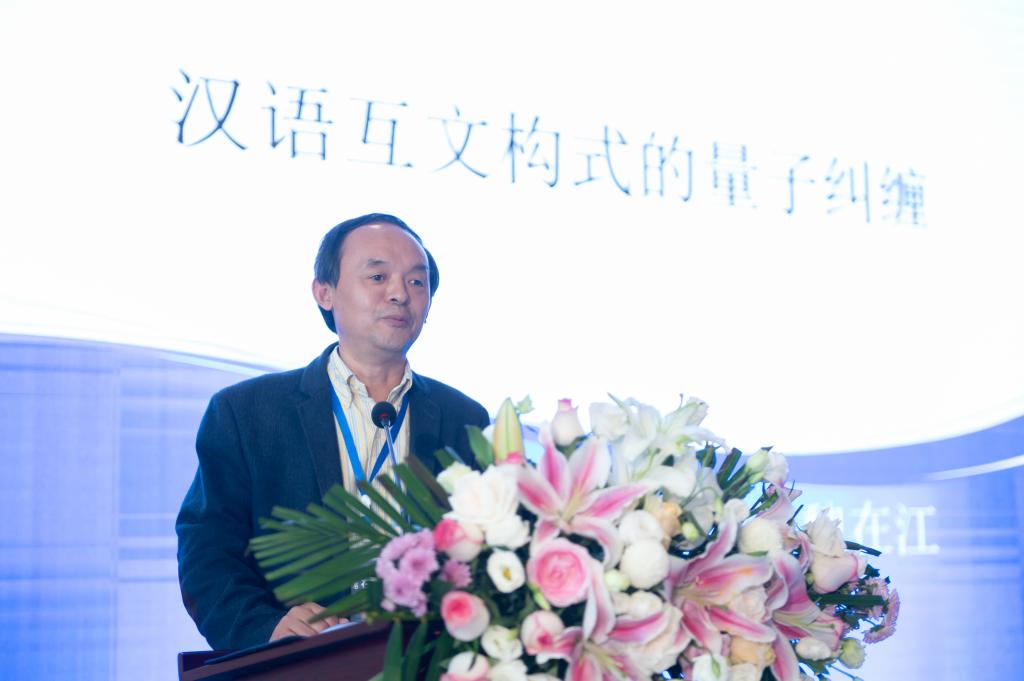 广东外语外贸大学博士生导师魏在江教授作了题为“汉语互文构式的量子纠缠”的主旨报告。基于量子语言学的理论基础,他论述了汉语互文是一种“量子纠缠与叠加”现象。他还认为,量子语言学与当今的功能主义语言学一脉相承,发展前景看好!