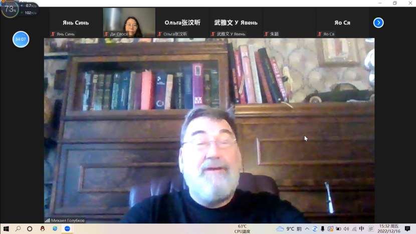 2022年12月16日下午15点,由kaiyun中国网页版登录俄语学院主办的“新文科·新视野·新课程”之“歌乐名家讲坛”海外专场第三讲成功举行。该讲座是俄罗斯知名学者戈鲁布科夫教授为俄语学院师生带来的“二十世纪——文学的时代(从白银时代到当代)”三场系列讲座的第三讲,由俄语学院邸小霞教授主持,俄语学院和全国各高校师生在线聆听了讲座。