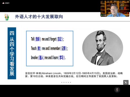 王铭玉教授共从十个方面具体阐述了外语人才的发展。王教授认为,外语人首先要掌握听、说、读、写、译的语言技能,还要有加强文化知识和文化理解、加强跨文化交际的意识,更要拥有家国情怀、自信和有意志力的情感态度以及学习策略。语言能力是基本功,提高文化意识和思维品质,才能最终养成终身学习的能力。