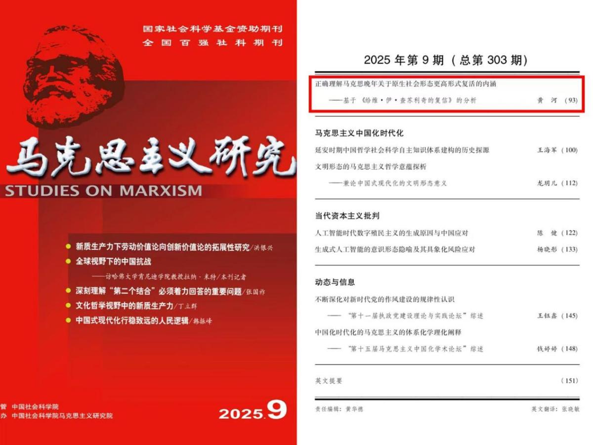 近日,我校马克思主义学院副教授、硕士生导师黄河撰写的《正确理解马克思晚年关于原生社会形态更高形式复活的内涵——基于〈给维·伊·查苏利奇的复信〉的分析》一文,刊发于马克思主义理论学科权威期刊《马克思主义研究》2025年第9期。