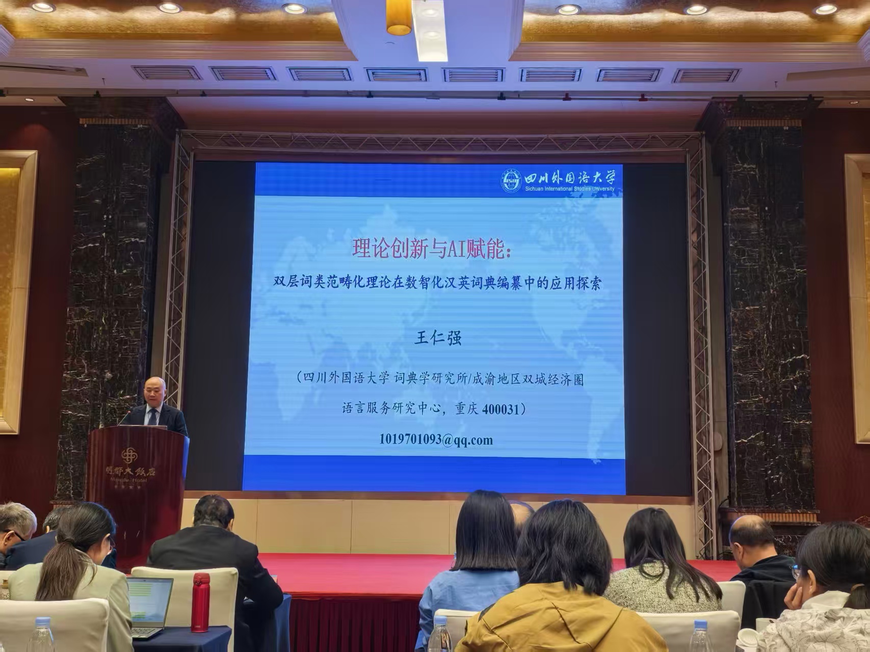 在大会报告环节,王仁强以《理论创新与AI赋能——双层词类范畴化理论在数智化汉英词典编纂中的应用探索》为题,围绕中国自主知识体系构建核心目标展开论述。报告聚焦双层词类范畴化理论的创新逻辑与实践价值,重点阐述该理论如何借助AI技术深度赋能,突破数智化汉英词典研发中的关键技术瓶颈,创新编纂方法,为“中国文化走出去”战略提供精准语言服务支撑,其观点获与会专家高度认可。